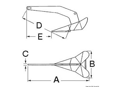 peso : 20 Catena raccomandata mm: 10 Consigliata per scafi fino m: 15,5 A mm: 877 B mm: 392 C mm: 16 D mm: 663 E mm: 357