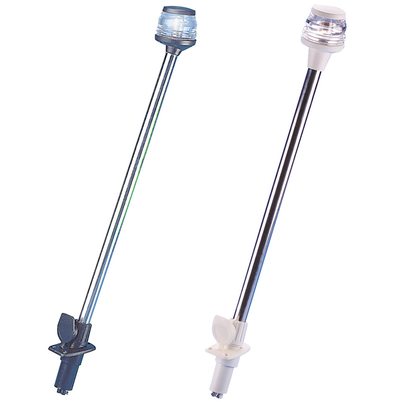 Asta in acciaio inox Ø mm. 19, estraibile, con innesto a baionetta in plastica, fanale a 360°, base mm. 65x44x65 prof., H mm. 600. Omologati R.I.Na. e M.M.M per imbarcazioni fino a 20 mt.