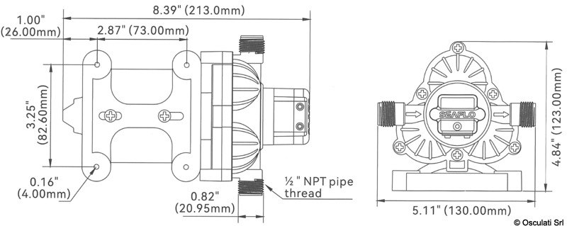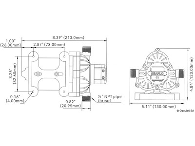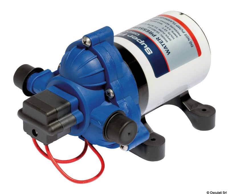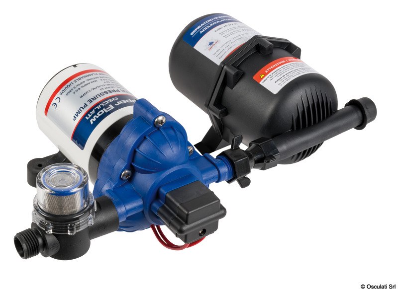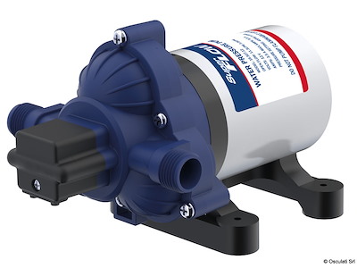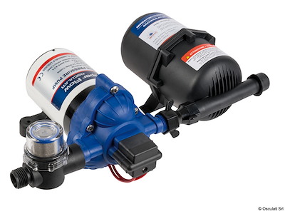 Autoclave a 3 valvole, può girare a secco senza rovinarsi. Perfettamente intercambiabile (stesse forature) con Flojet e Jabsco. Funzionamento silenzioso. Uscite filettate da 1/2" maschio. Include il filtro e 2 raccordi portagomma da 14 mm. Serbatoio di espansione 16.127.00 non incluso.