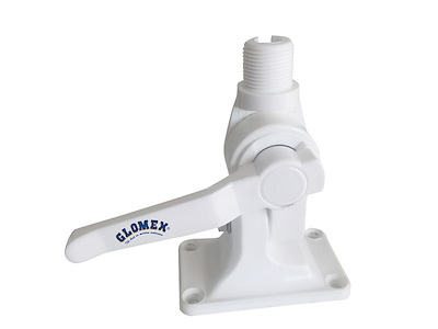 Base a doppio snodo in nylon rinforzato resistente ai raggi UV, con bloccaggio a leva e passaggio cavo e passacavo per accesso sottocoperta incorporato nella base.