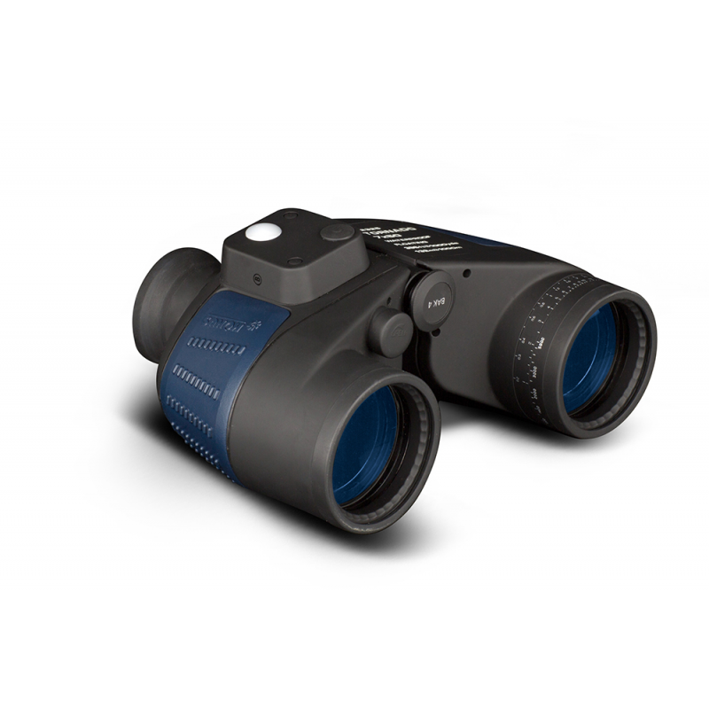 Binocolo con ottica 7 x 50. Galleggiante impermeabile anche immerso in acqua, interamente rivestito in gomma antiurto e interno con nitrogeno, messa a fuoco individuale, ottiche multitrattate, completo di bussola di rilevamento con illuminazione. Campo visivo (1000 mt.) 123 mt. Prismi BAK-4, completo di custodia, cinghiette e istruzioni. Peso g. 890.