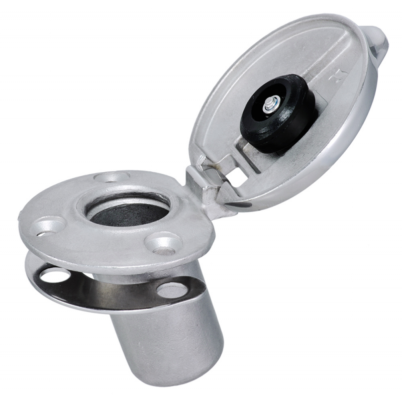 Boccola in acciaio inox AISI 316 ad incasso con tappo stagno e ghiera di fissaggio. Inclinazione 15°