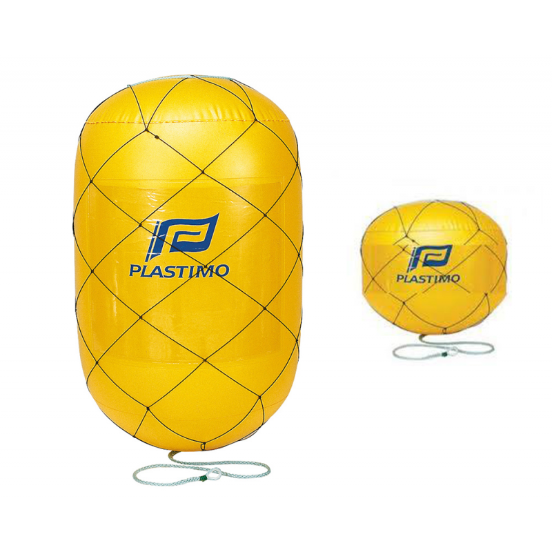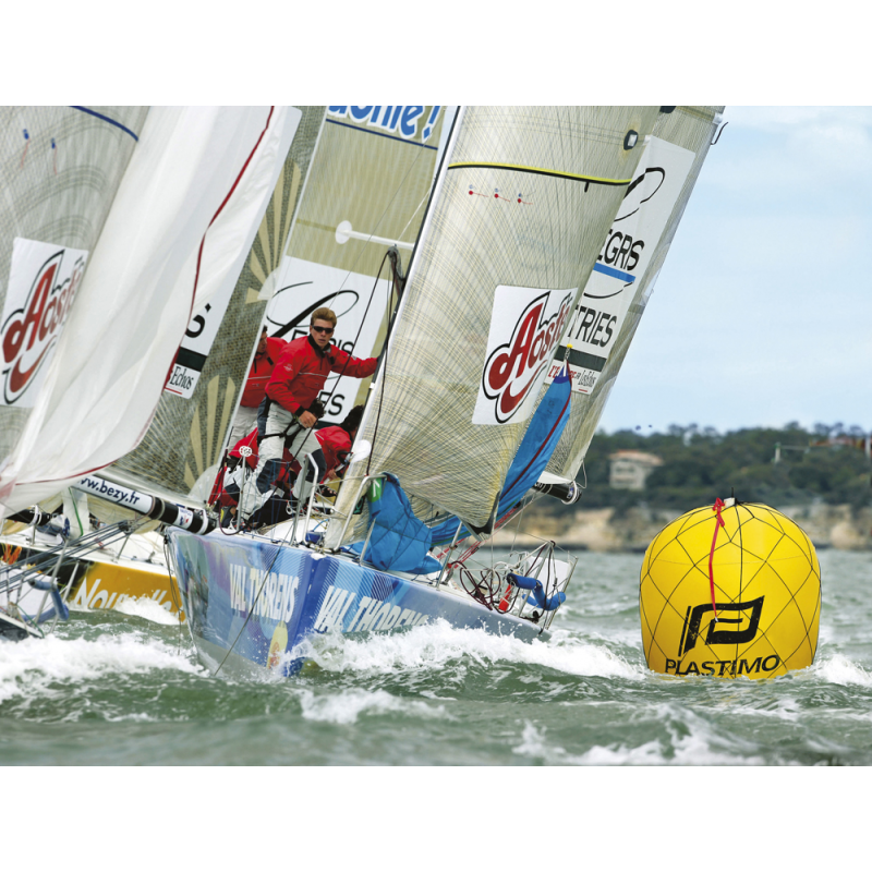 Boa da regata in PVC giallo, resistente ai raggi UV, non necessita di alcuna particolare cura. Munita di due maniglie per il trasporto, di due valvole per lo sgonfiamento rapido e provvista di una o due tasche trasparenti da cm. 69 x 60 per uso pubblicitario. La resistenza eccezionale dell’insieme è dovuta al fatto che la cima d’ancoraggio non è collegata alla boa, ma alla rete che la avvolge, così da ripartire su questa tutta la trazione. La boa non deve essere zavorrata, perché il suo principio richiede che essa si sposti liberamente sull’acqua senza offrire alcuna resistenza. Fornita con kit di riparazione : 1 tubo colla e una pezza in PVC. Modello Ø cm. 90, Altezza cm. 150, Peso gonfiata Kg. 4, Tasche trasparenti: 1, Rete ricambio: P22754