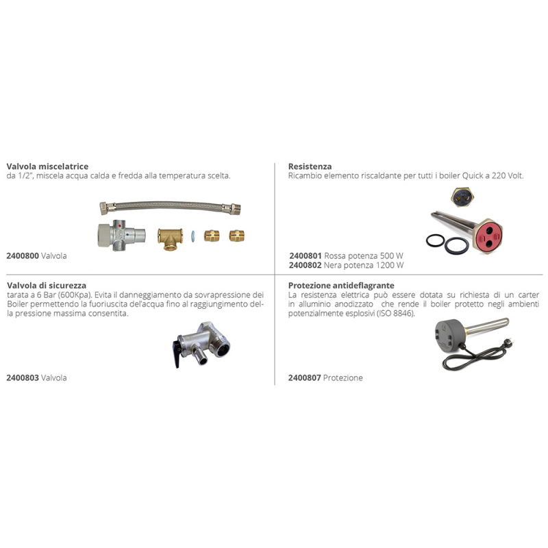 Boiler in acciaio inox AISI 304 con serbatoio in acciaio inox AISI 316 con scambiatore di calore. Selle e fasce in acciaio inox, incluse di serie. Raccorderia in uscita da 1/2”