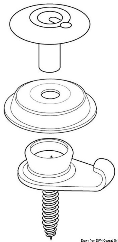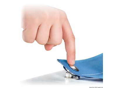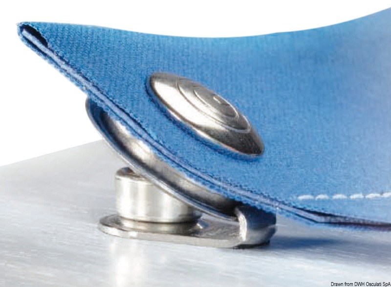 Bottoni in acciaio inox AISI 316. Il maschio presenta un dente di aggancio per la femmina, che a sua volta ha uno specifico labbro di ritegno. Le due novità combinate permettono di tendere al meglio il telo e nello stesso tempo ne evitano lo sgancio accidentale.