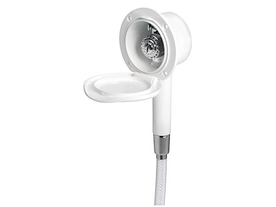 Doccia in ottone cromato, vano di alloggiamento bianco in ASA UV resistente.