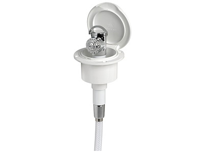 Doccia in ottone cromato, vano di alloggiamento bianco in ASA UV resistente.