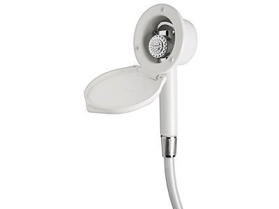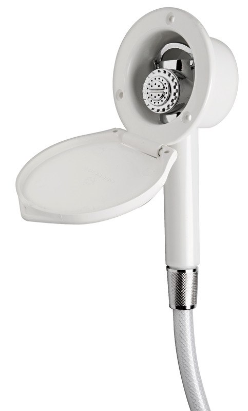 Doccia in ottone cromato, vano di allaggiamento bianco in ASA UV resistente. Sporgenza interna 45 mm.