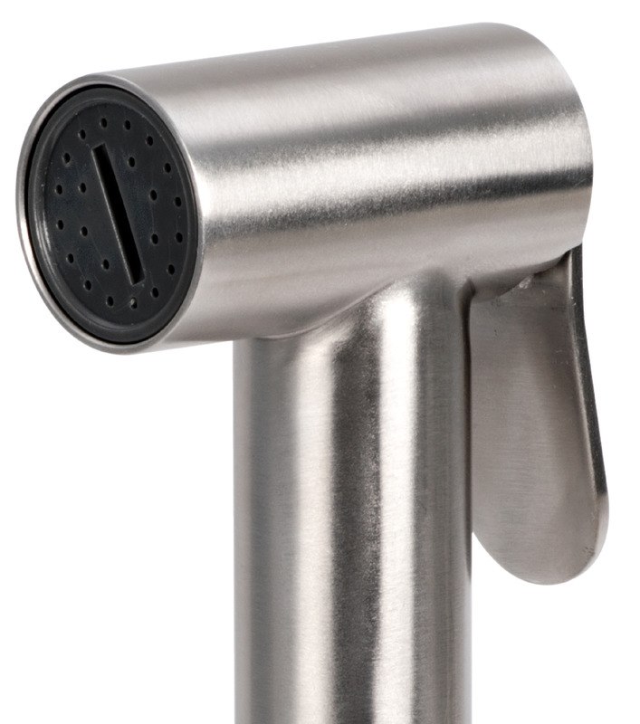 Vano doccia in acciaio inox AISI 316 con sportello autoreggente/frizionato. Doccetta Tiger in acciaio inox. Boccola interna antivibrante. Miscelatore a pomello cilindrico.