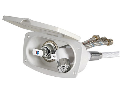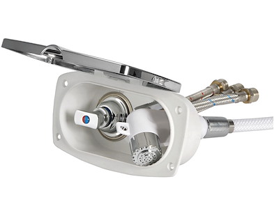 Doccia in plastica con testa cromata, vano di alloggiamento bianco in ASA UV resistente. Completa di rubinetto miscelatore acqua calda/ fredda. Montaggio in piano o a parete.