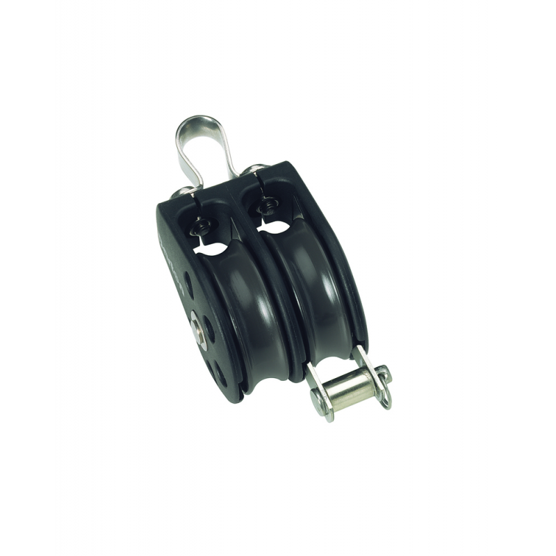 SERIE 1 - Bozzello doppio con occhio fisso e arricavo, Ø cima max mm. 8, max carico di lavoro kg. 355 carico di rottura kg. 710, dimensioni puleggia mm.30 x 12, lunghezza mm. 66 Carico di lavoro: 350 KG Carico di Rottura: 700 KG Modello: DOPPIO Ø: PULEGGIA 30 MM X H 12 MM Ø Cavo: MAX 8 MM TIPOLOGIA: FISSO CON ARRICAVO