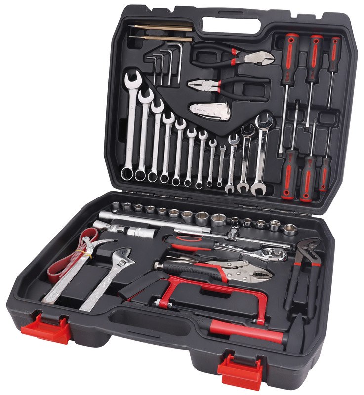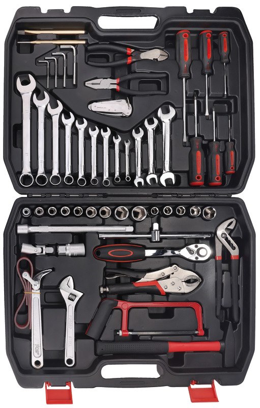 1 cacciaspina Ø 4 mm; 1 scalpello piatto 150 mm; 9 chiavi combinate 7-8-10-11-13-14-17-19-21 mm; 3 chiavi a forchetta doppia 3/8x7/16 - 1/2x9/16 -5/8x11/16”; 4 chiavi maschio esagonale piegate Ø 3-4-5-6 mm; 1 chiave regolabile a rullino con scala graduata 200 mm; 9 chiavi a bussola bocca poligonale Ø 10-11-12-13-14-17-19-22-24 mm; 5 chiavi a bussola bocca poligonale Ø 7/16 - 1/2- 9/16 - 11/16 - 7/8“; 1 prolunga con attacchi quadri maschio e femmina 1/2”, 250 mm; 1 snodo con attacchi quadri maschio e femmina 1/2”; 1 quadro maschio 1/2” con spina scorrevole; 1 cricchetto reversibile con attacco quadrato maschio 1/2”; 1 chiave a bussola con attacco quadro femmina 1/2” per candele d’accensione; 1 pinza regolabile, cerniera sovrapposta, manici ricoperti in PVC, 235 mm; 1 pinza regolabile autobloccante, ganasce concave, 220 mm; 1 tronchese a grande effetto a taglienti diagonali, manici ricoperti in PVC; 1 pinza universale manici ricoperti in PVC antiscivolo; 3 giraviti per viti con testa con intaglio 3x75 - 5,5x100 - 6,5x150 mm; 3 giraviti per viti con impronta a croce phillips 0x3x60 - 1x5x80 - 2x6x100 mm; 1 martello tipo tedesco con manico in legno; 1 chiave a nastro per filtri olio Ø max 160 mm; 1 miniseghetto; 1 coltello nautico in acciaio inox.