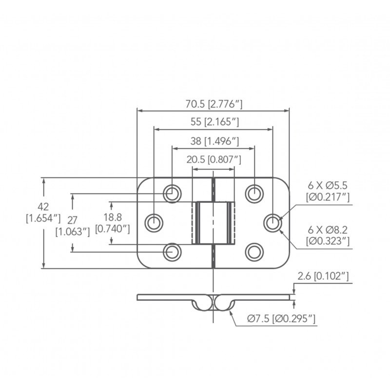 Cerniera in acciaio inox AISI 316 lucidata a specchio con arresto per tavoli dim. mm. 70x42, spessore mm. 2,6