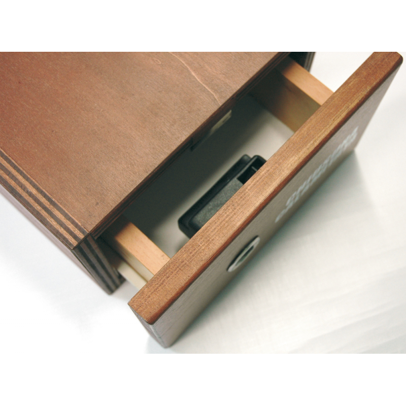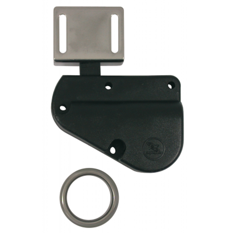 Chiusura in plastica e riscontro in acciaio inox, funzionamento con calamita per cassetti e ante mobili. Apertura tramite la boccola in acciaio inox.