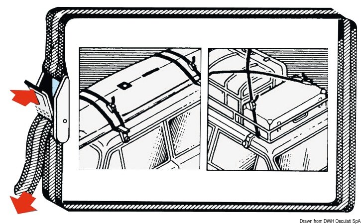 Resistenti ai raggi UV, con fibbia di tensione in zama a sganciamento rapido. Sono utili per il fissaggio delle tavole a vela, canotti, bagagli ed ogni altro oggetto trasportabile.