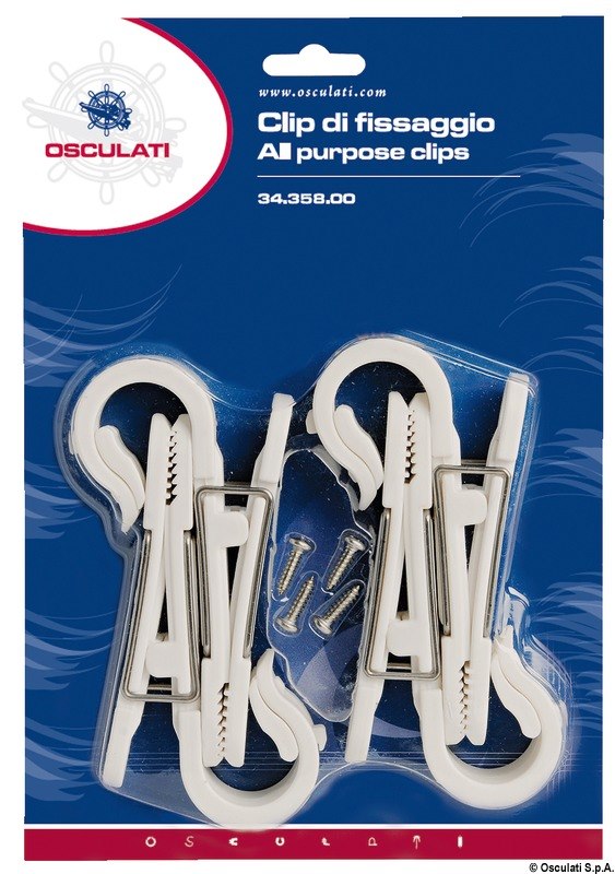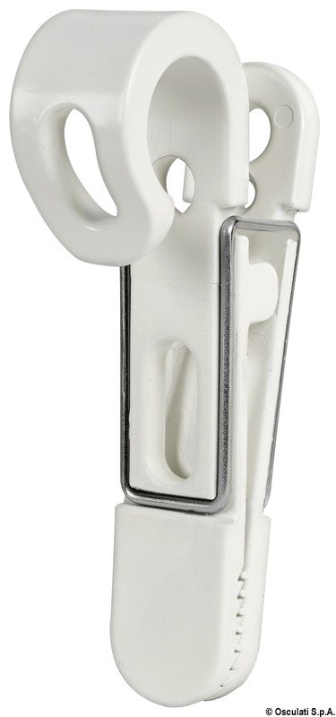 Si può fissare a parete tramite una vite, oppure agganciare al pulpito a scatto (accetta tubi Ø 22/28 mm). Può servire per appendere vestiti ad asciugare, cime, cavi elettrici, ed ogni altro oggetto. Costruita in nylon bianco + molla in acciaio inox.