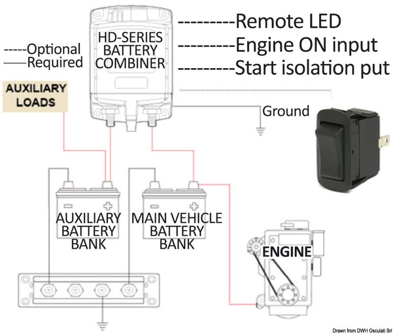 Collega i banchi batterie (avviamento + servizi) quando è in funzione alternatore/caricabatterie e scollega i banchi quando cessa il sistema di ricarica. Supporta alti carichi di corrente (es. inverter potenti). Possibilità di collegare i banchi batteria in caso di emergenza, con un semplice comando tramite interruttore. Bassissimo consumo in ON/OFF dovuto al sistema bistabile. Soddisfa ISO 8846/SAEJ1171. Connettore Deutsch 6 poli DTM maschio.
