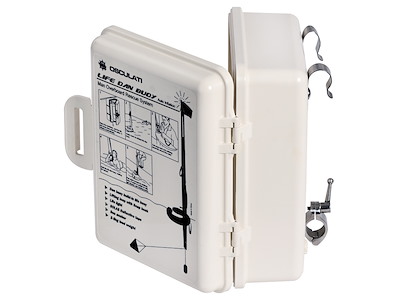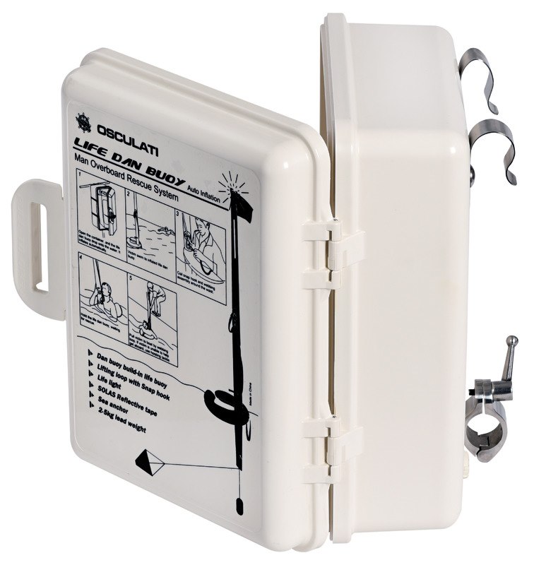 Sistema di salvataggio contenuto in una cassetta in robusto ABS. Nel caso di uomo a mare basta aprire la cassetta appesa al pulpito per rilasciare il sistema che si gonfierà automaticamente a contatto con l'acqua. Il naufrago troverà il salvagente gonfiato con un asta ed una luce per essere individuato.