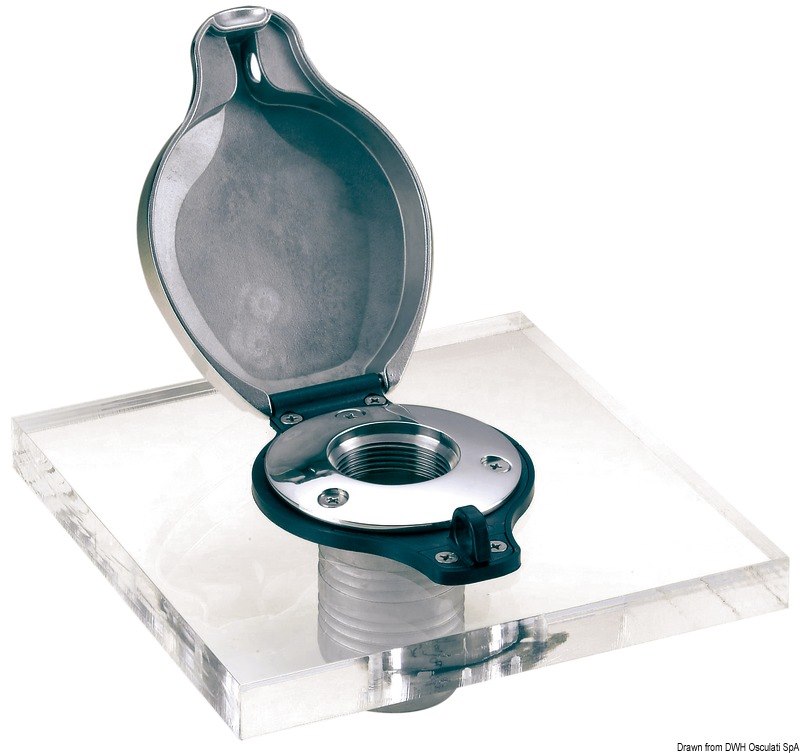 Realizzato in acciaio inox AISI 316 lucidato, è universale per tutti i tappi in commercio e si installa senza smontare il tappo esistente, ma solamente allentando le viti di fissaggio.