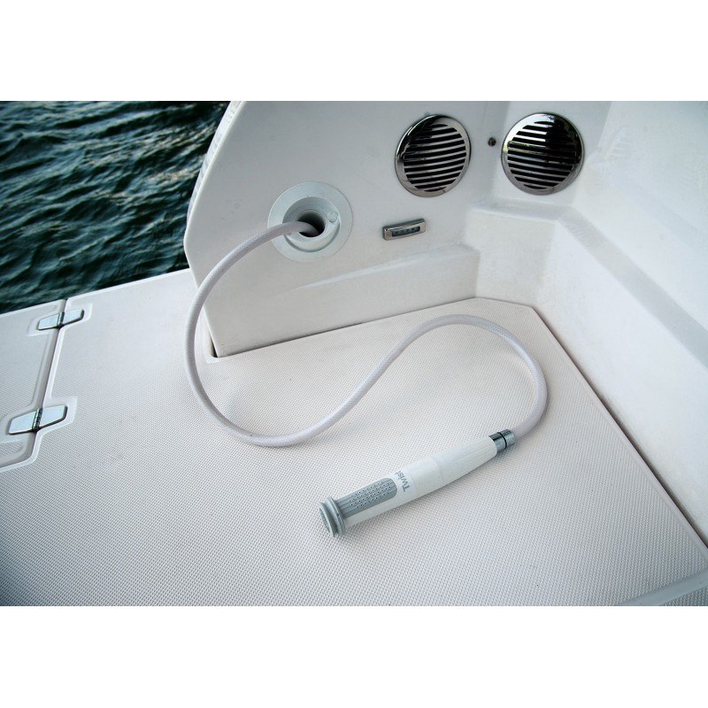 Doccia a mano integrata Twist in ABS, design ergonomico e resistente ai raggi UV. Il tappo terminale crea una tenuta a prova di spruzzi. Due opzioni di alloggiamento, orizzontale o verticale. Facile da installare, solo un foro circolare da tagliare e semplice collegamento idraulico. Il miscelatore è integrato nel manico per il controllo della temperatura e del flusso.