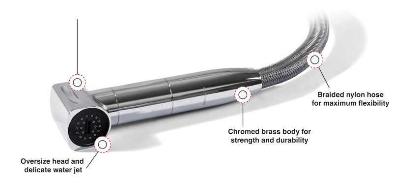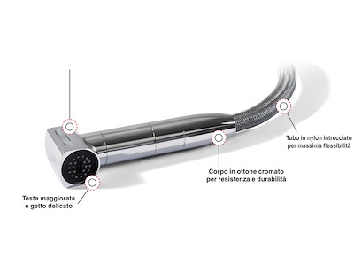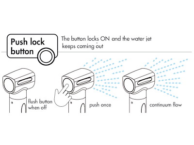 Regolazione del flusso d’acqua tramite bottone push lock che consente di bloccare il getto d’acqua.