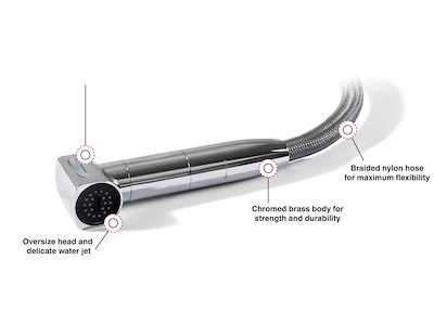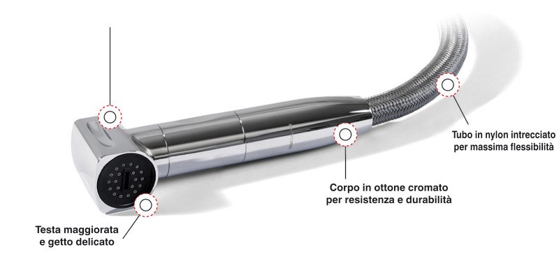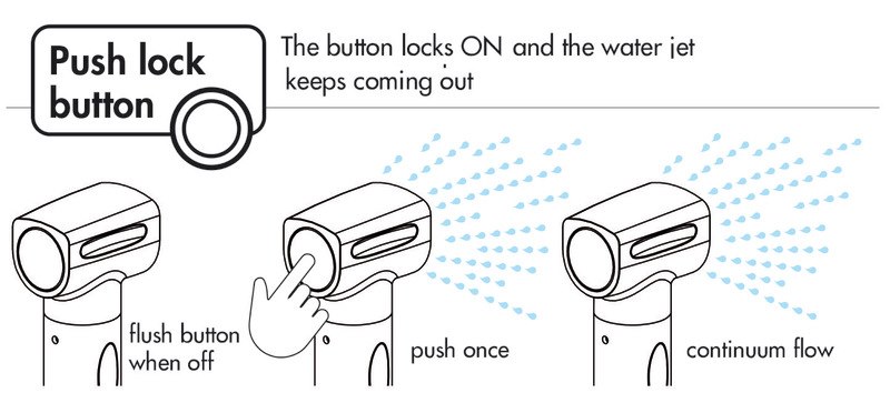 Regolazione del flusso d’acqua tramite bottone push lock che consente di bloccare il getto d’acqua.