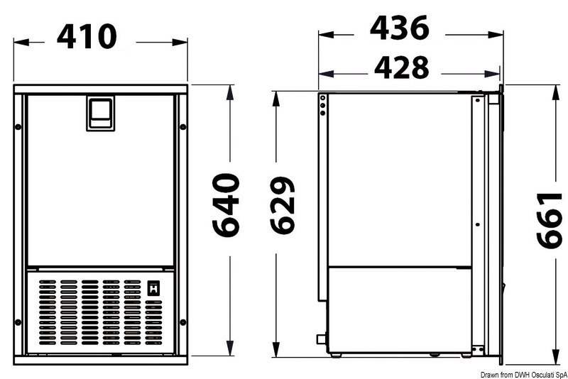 Completamente in acciaio inox, capace di produrre al massimo 8 kg/giorno di ghiaccio bianco. Si distingue per il suo design e per la possibilità di un incasso parziale con cornice su 3 lati o totale, richiedendo a parte la flangia inferiore. Grazie all’esclusivo sistema di ventilazione del gruppo moto condensatore nella parte frontale, è particolarmente indicato per le elevate temperature esterne. Assorbimento 180W e dimensioni che variano a seconda dell’inserimento o meno delle flange. Si consiglia di lasciare 5 cm di spazio posteriormente all’icemaker per lo scarico dell’acqua e per le relative connessioni. Peso 29 kg.