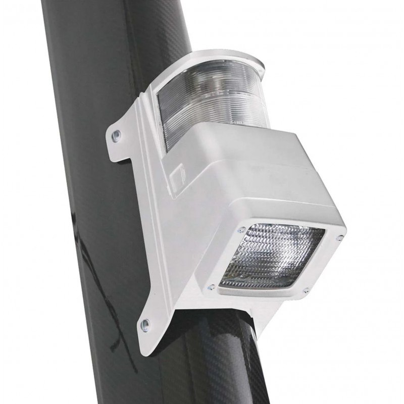 Fanale testa d'albero e proiettore da ponte combinati in un unico robusto alloggiamento in plastica resistente ai raggi UV e agli urti. Lampadine BAY15d da 12V/10W e H3 da 12V/55W incluse. I bracci dell'alloggiamento si flettono per adattarsi all'albero. La lampada di testa d'albero e il proiettore di coperta sono cablati separatamente.Adatto a imbarcazioni di lunghezza inferiore a 20 m.