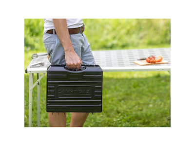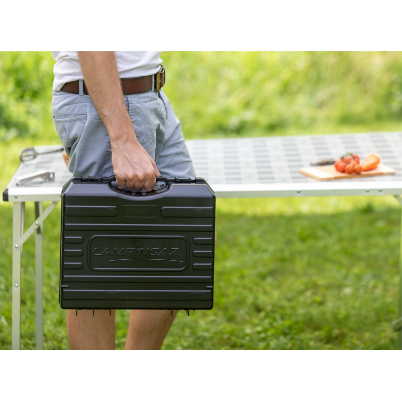 Fornello in acciaio, leggero e compatto, accensione piezoelettrica con sistema di chiusura di sicurezza della cartuccia per un utilizzo sicuro. Facile da pulire grazie al vano cattura grasso. Con valigetta per il trasporto inclusa.