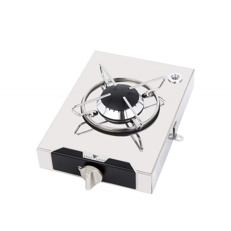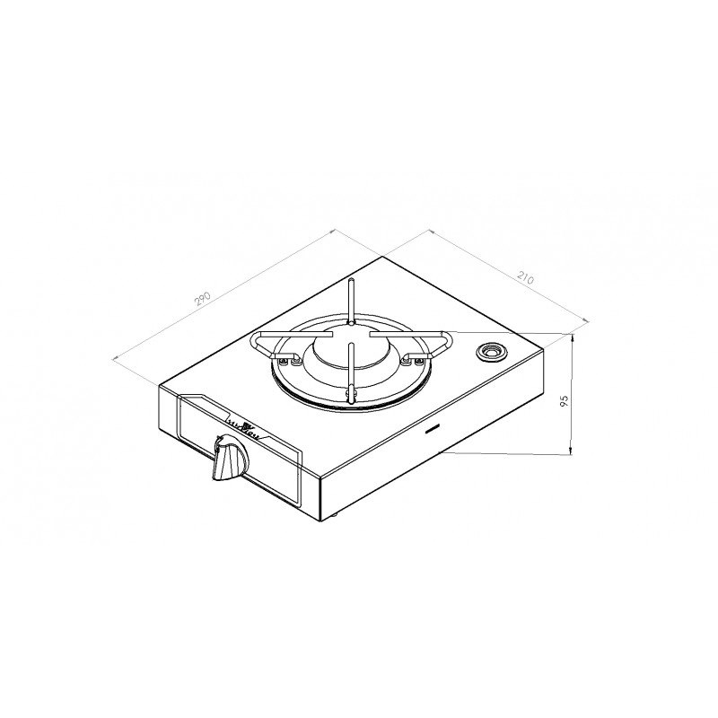 Piano cottura da appoggio a gas con accensione manuale, in acciaio inox lucidato a specchio. Con termocoppia di sicurezza. Completo di staffe e viti di fissaggio. Con foro per ferma pentole. Certificati CE. Fuochi: 1 Portata: 1,8 KW Dimensioni: 210X290X95 MM Peso: 2,5 KG