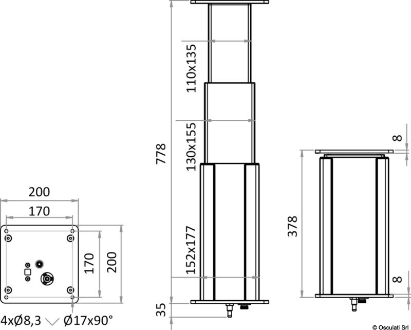 Gamba tavolo elettrica a tre stadi in alluminio anodizzato argento o nero, adatta sia all'esterno sia all'interno barca. Per azionamento gambe singole è necessario interruttore (ON)-OFF-(ON) tipo 14.192.03 o simili. Per azionamento gambe in sincro ordinare centralina/ricevente 48.831.12 o 48.831.24.
