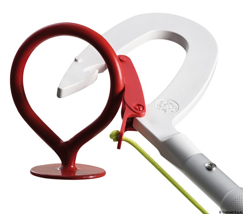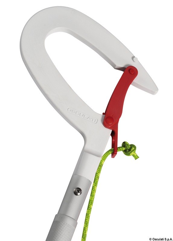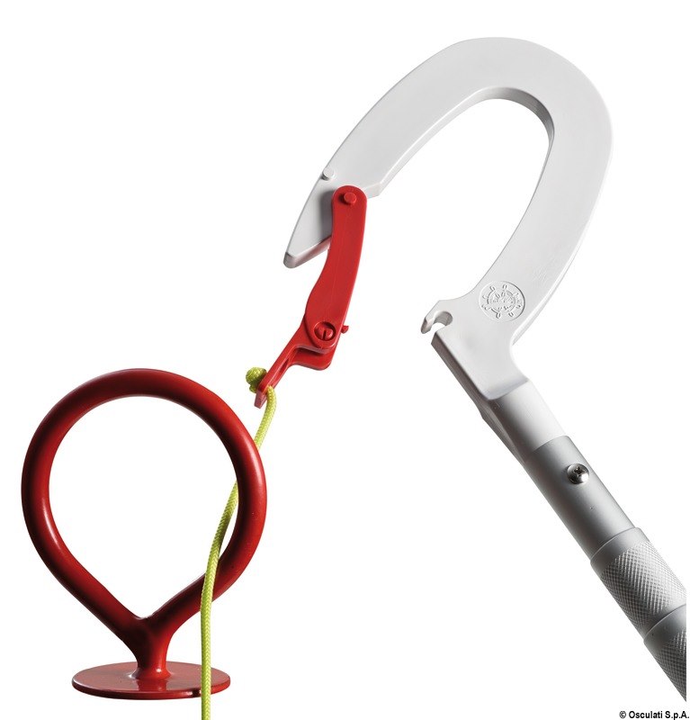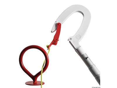 Oltre a funzionare come gancio d'accosto permette con un solo movimento di agganciare l'occhio del gavitello e recuperare a doppino la cima di ormeggio.