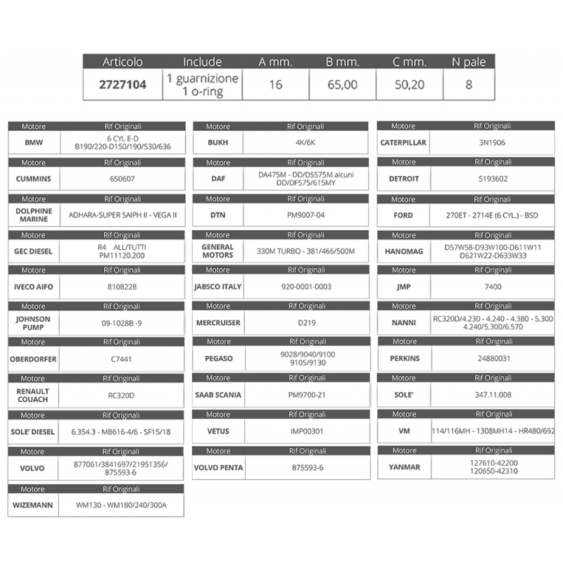 Caterpillar: 3N1906Cummins: 650607Detroit: 5193602Jabsco: 920-0001-0003Jmp: 7400Johnson Pump: 09-1028B -9Nanni: 4.230 - 4.240 - 4.380 - 5.300Oberdorfer: C7441Perkins: 24880031Renault Couach: RC320DSolè: 347.11.008Vetus: IMP00301Volvo: 877061 / 3841697 / 21951356 / 875593-6Yanmar: 127610-42200 / 120650-42310Mercruiser: 47-801332602