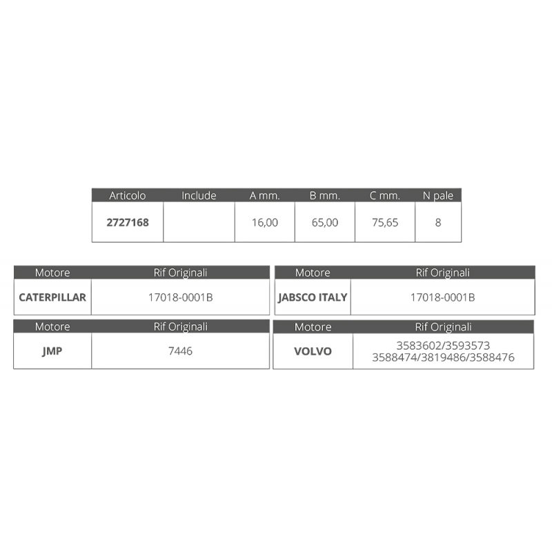 Caterpillar: 17018-0001BJabsco: 17018-0001BJmp: 7446Volvo: 3583602 / 3593573 / 3588474 / 3819486 / 3588476