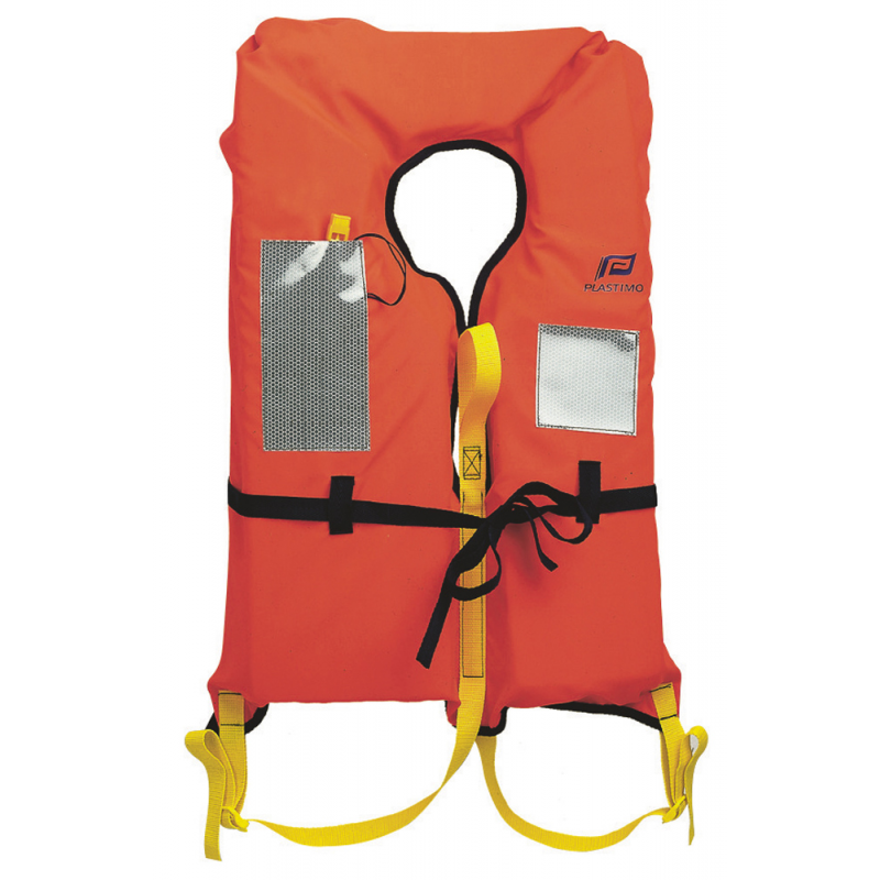 Giubbotto di salvataggio 150N a salvagente fabbricato con tessuto 100% poliestere di colore arancione fluorescente riempito di schiuma in polietilene, munito di strisce retroriflettenti e di fischietto. Chiusura con laccino di serraggio in vita. Doppia cinghia inguinale regolabile. CE EN ISO12402-3