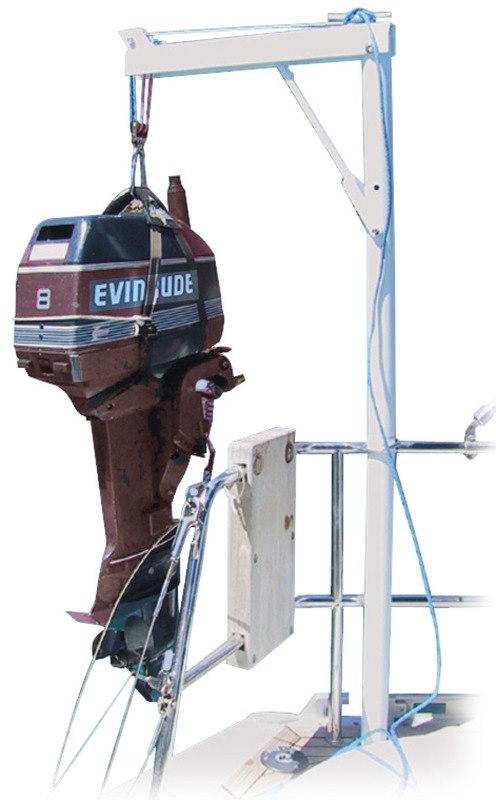 In alluminio, progettata per calare sul tender il motore fuoribordo. Si può togliere e mettere in pochi secondi essendo sfilabile dal supporto. Verniciata bianca con resine epossidiche, completa di paranco con bozzelli inox più moschettone inox, universale per qualsiasi imbarcazione, fornita di sacca.