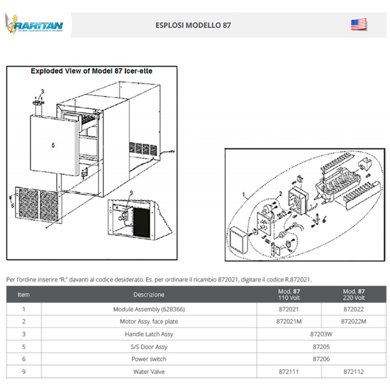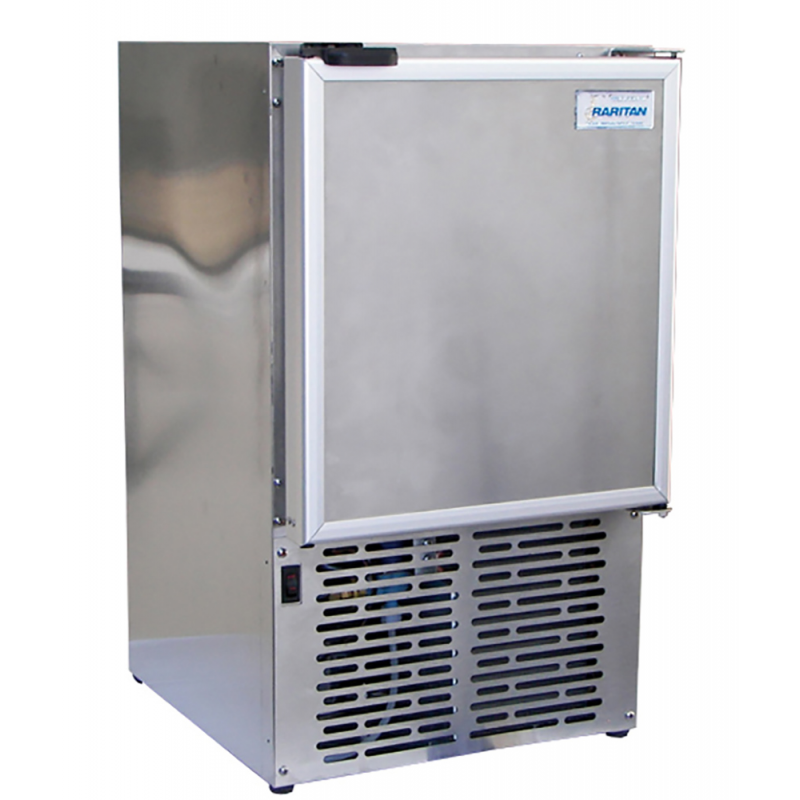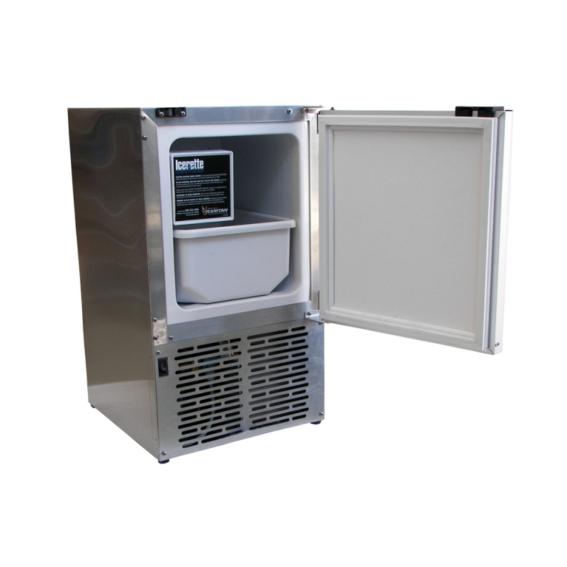 Fabbricatore di ghiaccio affidabile, sicuro, completamente automatico, disegnato specificatamente per le applicazioni marine. L’installazione semplice sia per il modello ad incasso che esterno. Non richiede nessun tipo di scarico. Si collega al serbatoio dell’acqua dolce di bordo o a un serbatoio supplementare. La serpentina circonda completamente l’evaporatore assicurando così una refrigerazione uniforme. Gas refrigerante senza CFC. Produce fino a 10 kg di ghiaccio (a forma di mezzaluna) al giorno. La vaschetta estraibile contiene 5 kg. di ghiaccio. La produzione si blocca automaticamente quando la vaschetta è piena. Chiusura ermetica magnetica, con cardini ed anello di acciaio inox. La porta in acciaio inox, è predisposta per apertura destra o sinistra.Mobile e porta in acciaio inox. Dim. largh. mm. 356, prof. mm. 368, alt. mm. 622. Dim. con flangia largh. mm. 391, prof. mm. 368, alt. mm. 641. Peso kg. 30 circa.