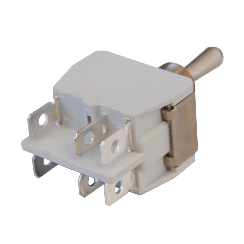 Interruttorecorpo in termoindurente, levetta e bussola in ottone nichelato, contatti in argento. Terminali Faston. Capacità 15 Amp. tensione 250V, unipolare.Perno Ø mm. 12. Completi di cappuccio in gomma.