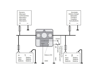 Charge Mate è un relè da batteria automatico che collega due sistemi di batterie quando il voltaggio supera un valore pre-settato (>13V a 12V / >26V a 24V) per almeno 5 secondi permettendo ai due sistemi di batteria di caricarsi simultaneamente. Quando il voltaggio scende (<12,75V a 12V / <25,50V a 24V), i sistemi di batteria saranno nuovamente isolati. Mediante un interruttore (non incluso) il caricatore può essere usato per mettere i parallelo un solenoide per avviamenti di emergenza. Rif. Originale 83302502