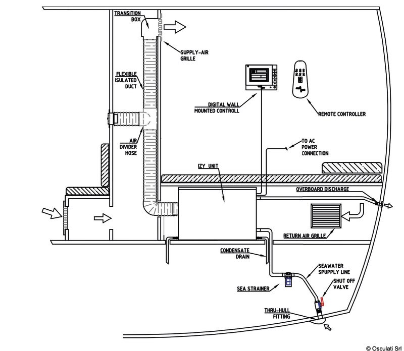 IZY è l’esclusivo prodotto che rende semplice ed accessibile anche ai "non addetti ai lavori" l’installazione di un impianto completo di aria condizionata all’interno di qualsiasi imbarcazione. Racchiusi all’interno di una resistente e poco ingombrante struttura in acciaio inox 316, isolata internamente per il massimo abbattimento delle emissioni sonore, si trovano: - un compressore ad elevata efficienza; - uno scambiatore in cupro-nichel resistente alla corrosione; - una batteria di scambio termico gas refrigerante-aria; - la pompa di circolazione dell’acqua di mare; - tutta la componentistica elettrica e elettronica. La modalità riscaldamento viene attivata tramite l’impiego di una resistenza elettrica; in questo modo, diversamente da quanto avviene nei sistemi a pompa di calore con inversione di ciclo, il rendimento del condizionatore non è influenzato dal diminuire della temperatura dell'acqua di mare durante la stagione fredda e si ottiene pertanto il 100% della potenza termica disponibile anche con temperatura dell'acqua inferiore ai 10°C. Alimentazione 220V . * Kit distribuzione aria e ricircolo acqua mare OPTIONAL da ordinare separatamente cod. 50.268.00 / 50.267.99
