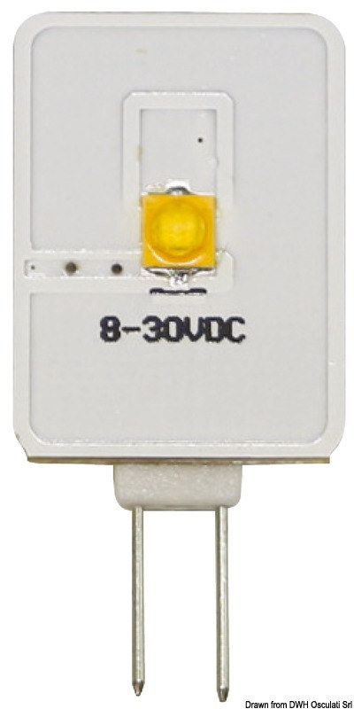Modello con LED singolo SMD di elevata potenza. Zoccolo: G4 V: 12/24 W: 1,5 W equivalenti: 15 Lumen: 130 K: 3000 Angolo LED: 120° Attacco: Laterale misure mm: 33x16