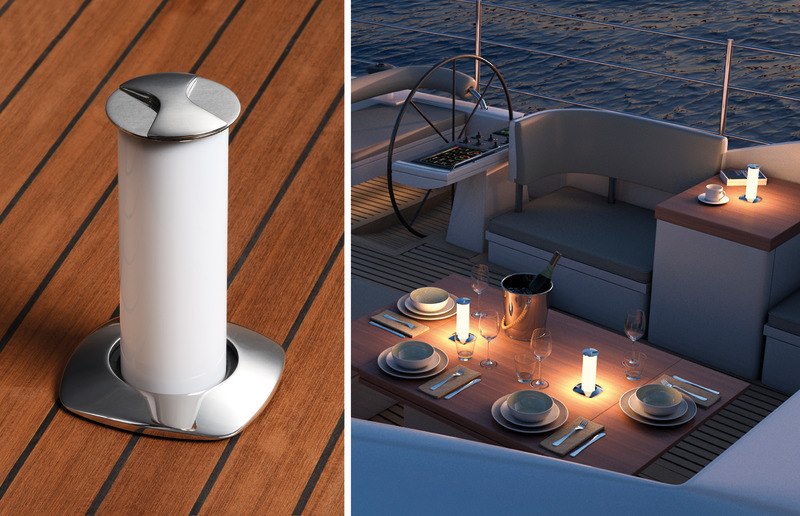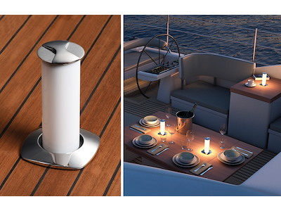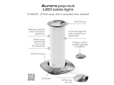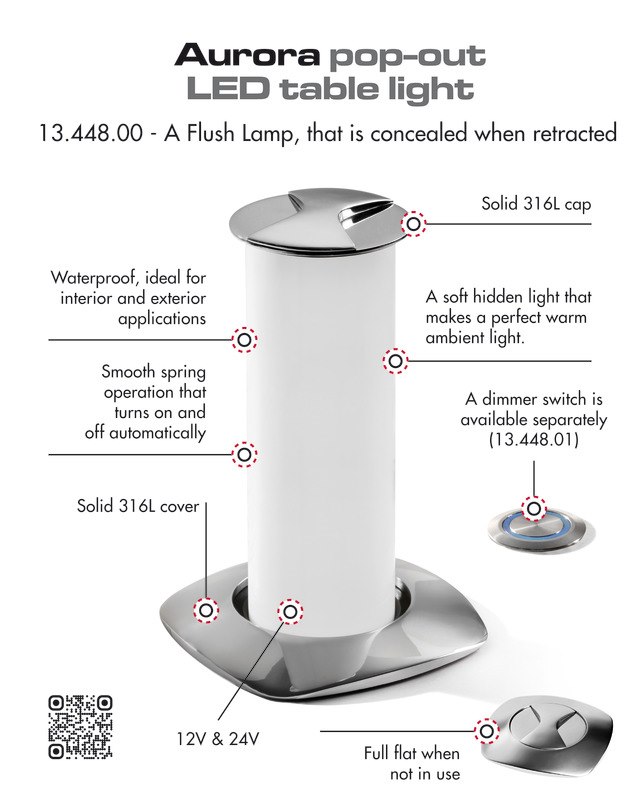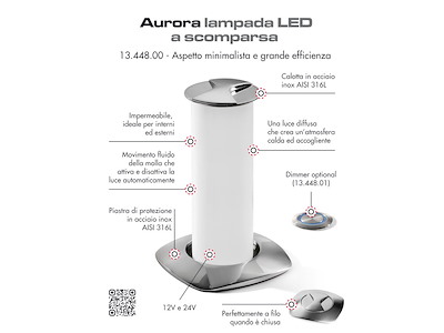 Da spenta la luce rimane a filo piano del tavolo e con una leggera rotazione del piattello inox superiore si alza accendendosi automaticamente. Dimmerabile con apposito optional (13.448.01) per abbassare la luce con effetto "ambientazione". Parte superiore in acciaio inox AISI 316 lucidato a specchio.