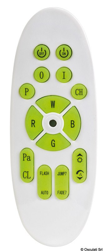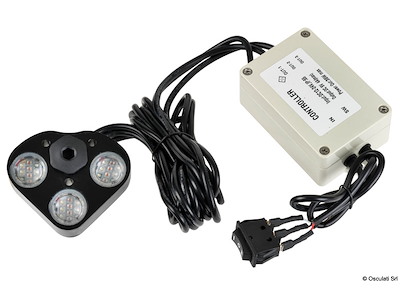 Corpo in lega leggera anodizzata nera. Alimentazione 12/24 V. Versione A: Cilindrica Ø 32 mm. Filetto posteriore 1/2" NPT. Si applica in abbinamento con il tappo inox 18.542.00 nel quale si avvita la luce. Versione B: Da avvitare con telecomando a distanza incluso (fino a 15 m). 3 moduli con possibilità di programmazione dei colori, della sequenza, effetto strobo, flash, etc. Cavo in dotazione da 1,5 m.