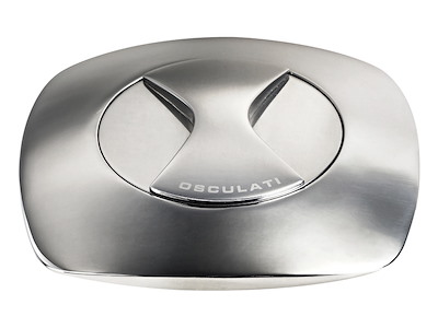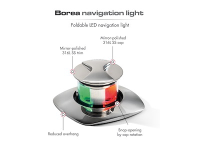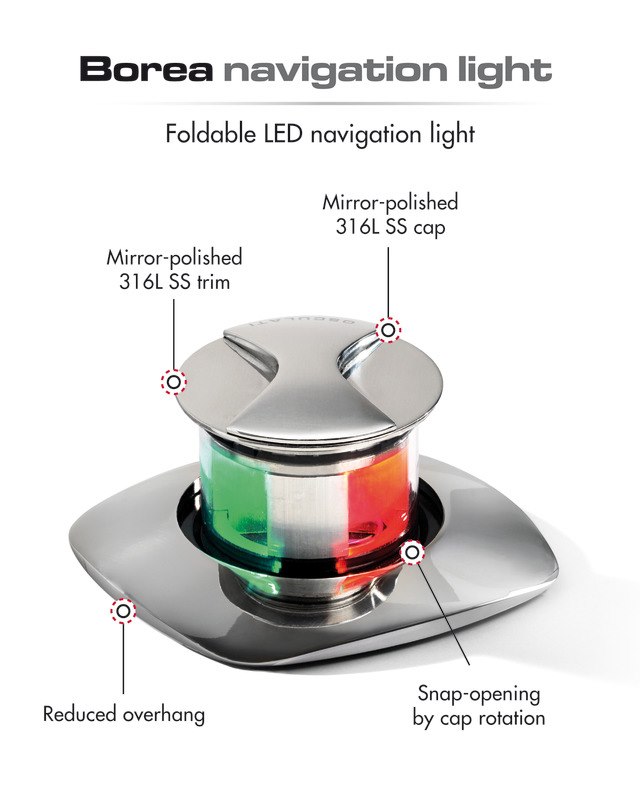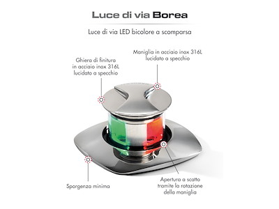 Carcassa in tecnopolimero e in AISI 316 lucidato a specchio. Con una leggera rotazione del piattello inox superiore il fanale si alza in posizione d'uso.