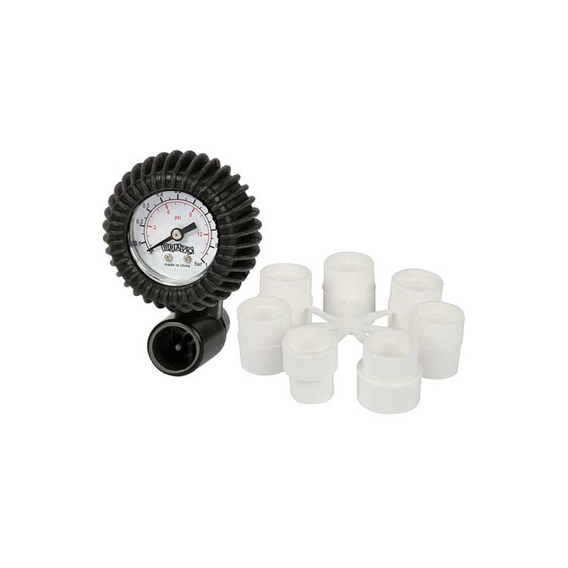 Manometro per il controllo della pressione fino ad mbar 1000. Inserito tra il gonfiatore e la valvola ne permette la lettura progressiva durante il gonfiaggio, oppure inserito direttamente nella valvola, la lettura immediata.