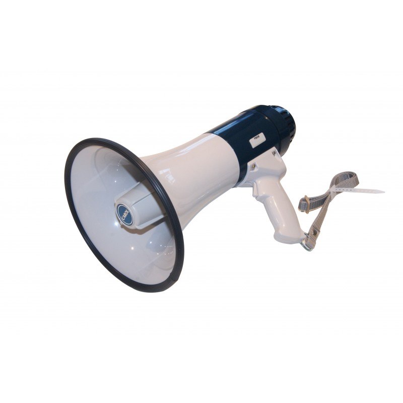 Megafono elettronico con sirena e fischio, struttura ABS compatta e robusta, alimentazione con 10 batterie AA ricaricabili (non incluse), durata 25 ore circa, potenza 15 W. nominali, portata 250 mt.. Dimensioni Ø mm. 203, lunghezza mm. 350, peso Kg. 1.