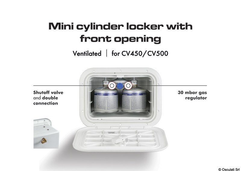 Il gavone è dotato di un regolatore gas da 30 mbar, rubinetto di chiusura flusso e doppio attacco per alloggiare due bombole con valvola avvitabile (EN417) max 500 gr.
