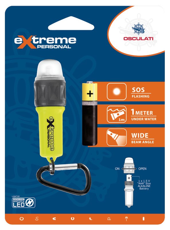 Si può collegare al giubbotto di salvataggio tramite il moschettone o usare come una piccola torcia. Funzioni: luce fissa o flash. Sommergibile fino a 1 m. Accensione a rotazione ghiera.