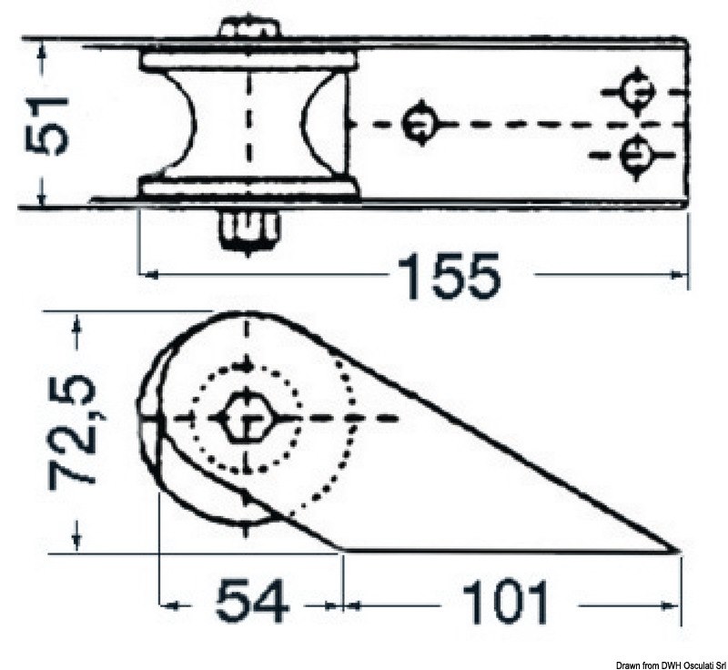 In acciaio inox 304 satinato , con puleggia in nylon peso : 0.48 Lunghezza mm: 155 Larghezza mm: 51 Altezza mm: 72 Puleggia di ricambio: [01.218.82]