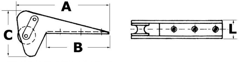 In alluminio lucidato e anodizzato . Sfrutta la particolare forma delle Bruce e Trefoil® al fine di essere autobloccante. Quando l’ancora viene salpata, si incastra saldamente nel musone evitando bloccaggi manuali. Puleggia in nylon .